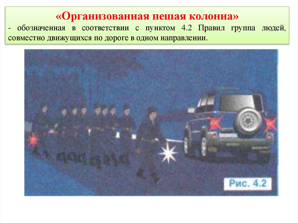 «Организованная пешая колонна»- обозначенная в соответствии с пунктом 4.2 Правил группа людей,