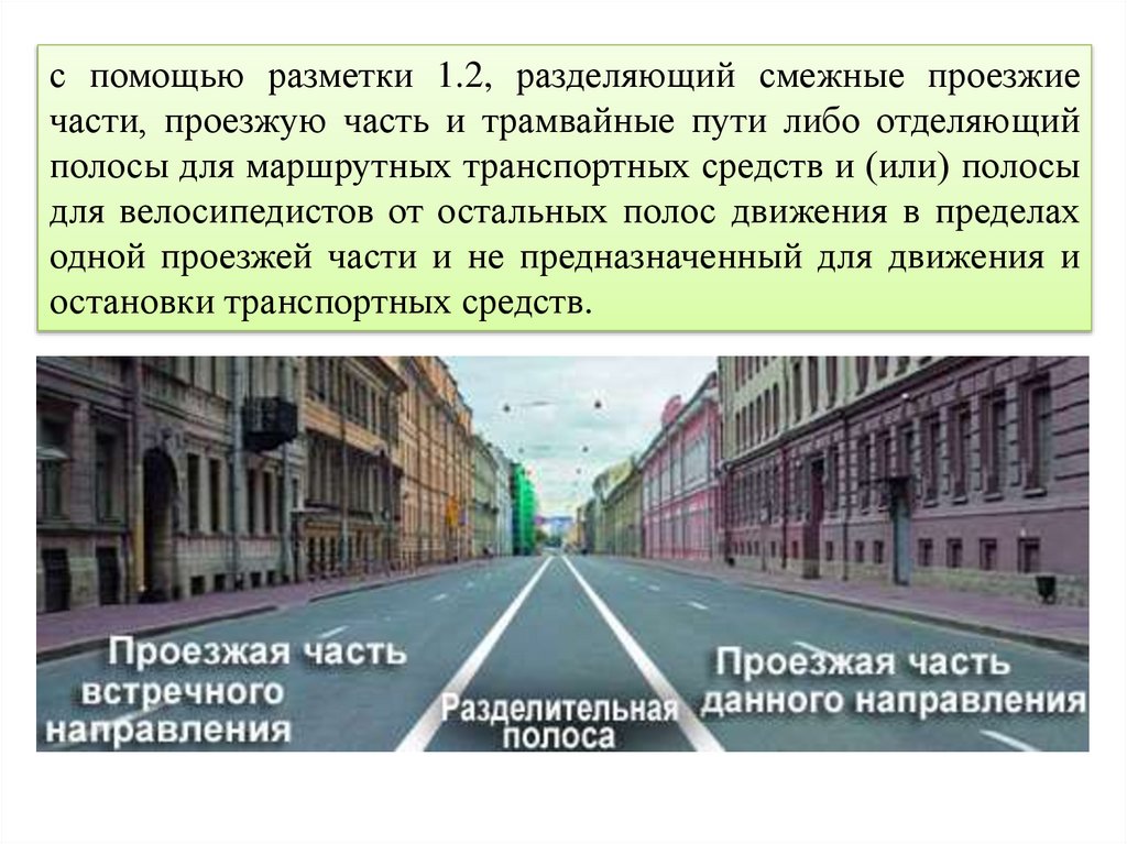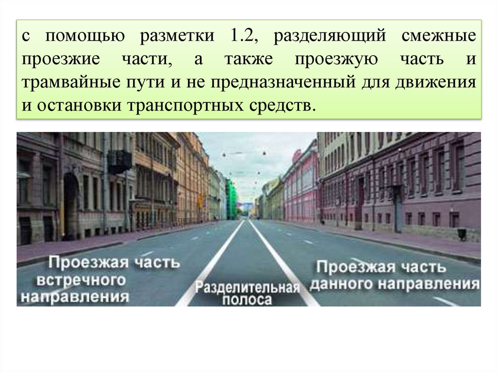 с помощью разметки 1.2, разделяющий смежные проезжиечасти, проезжую часть и трамвайные пути либо отделяющий