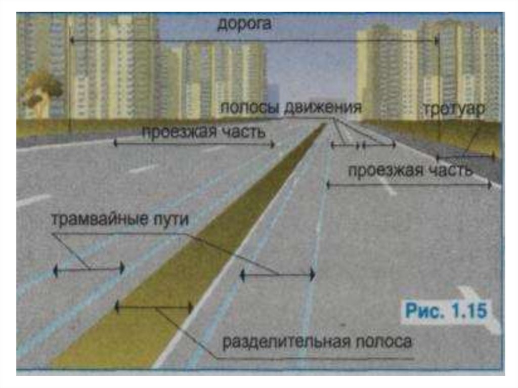 Дорога включает в себя одну или несколько проезжихчастей, а также трамвайные пути, тротуары, обочины и
