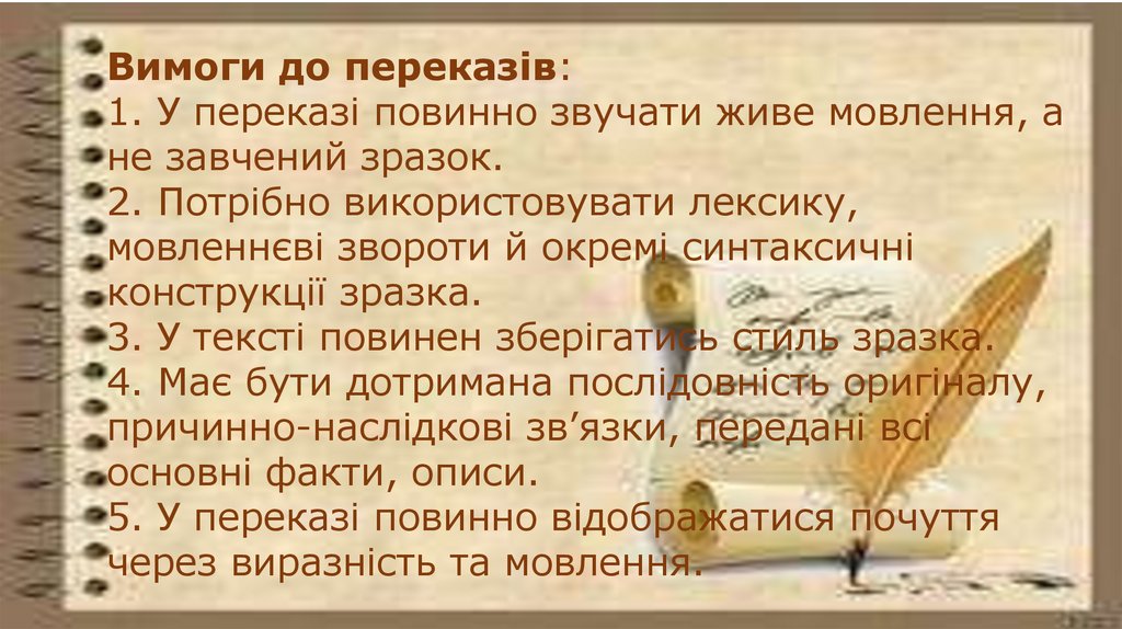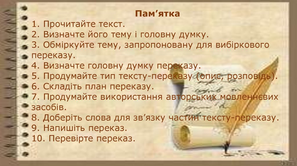 5. Продумайте тип тексту-переказу (опис, розповідь).