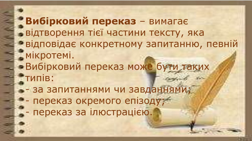 Вибірковий переказ – вимагаєвідтворення тієї частини тексту, яка
