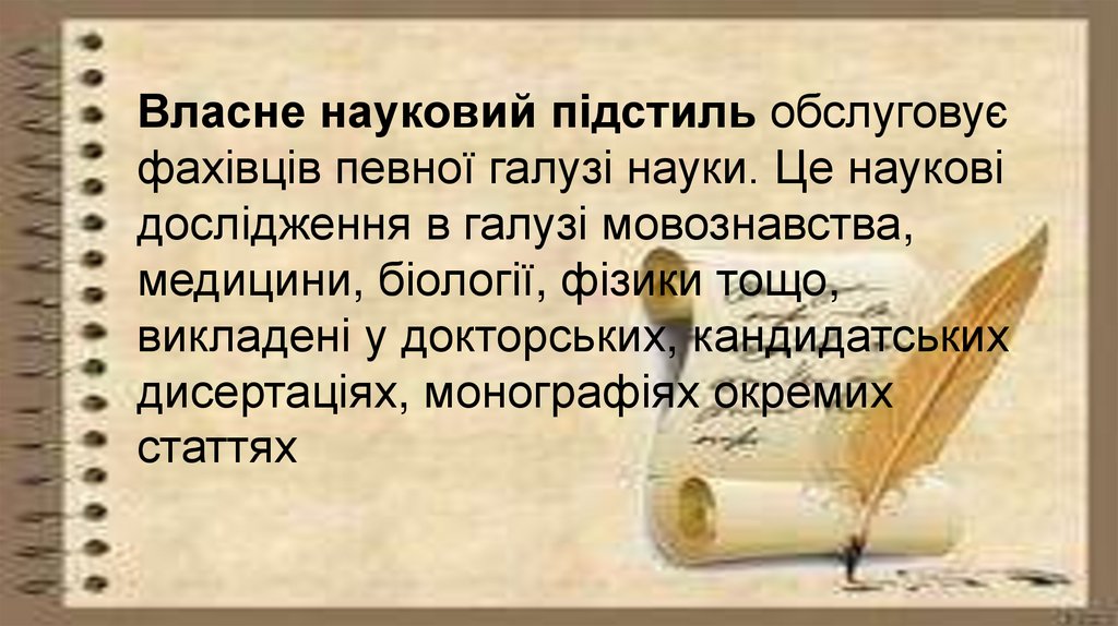 Власне науковий підстиль обслуговуєфахівців певної галузі науки. Це наукові