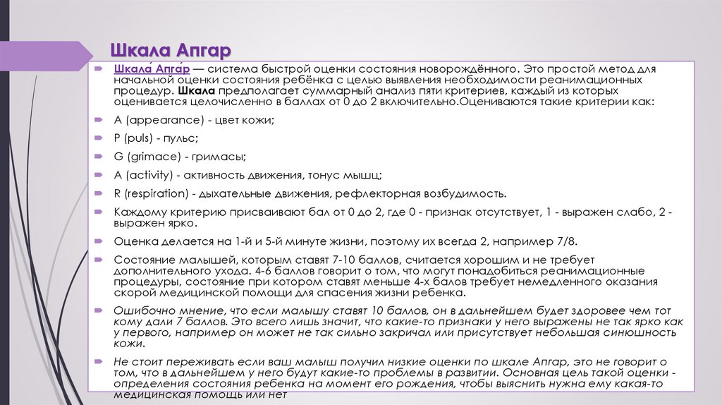 Шкала АпгарШкала́ Апга́р — система быстрой оценки состояния новорождённого. Это простой метод для