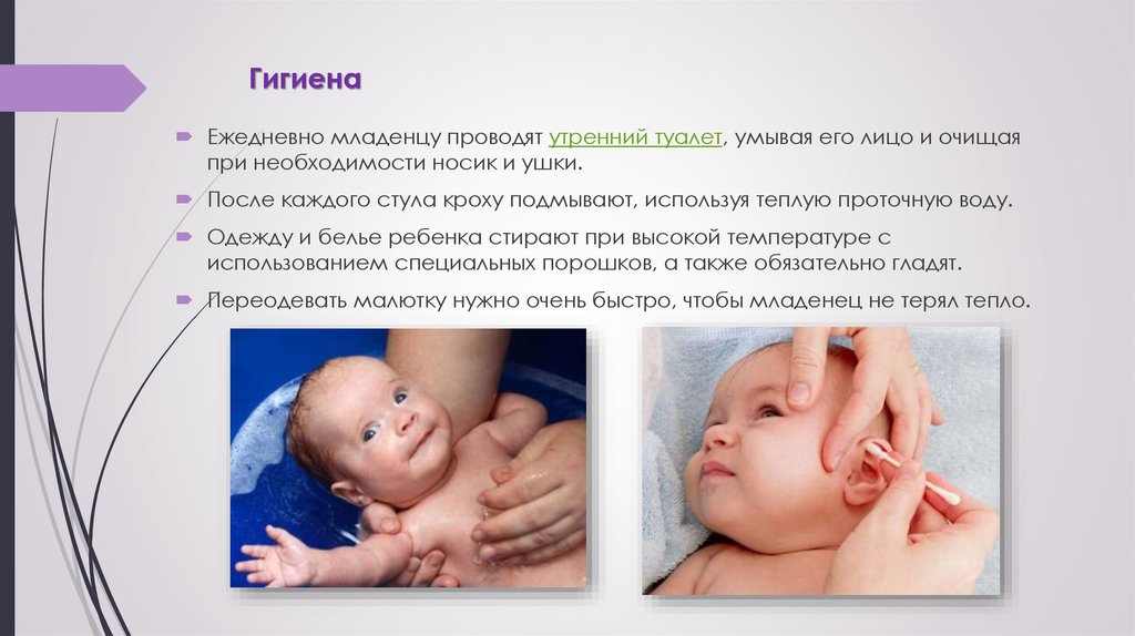 ГигиенаЕжедневно младенцу проводят утренний туалет, умывая его лицо и очищая