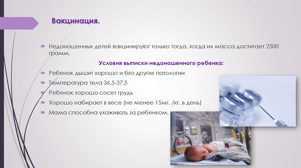 Вакцинация.Недоношенных детей вакцинируют только тогда, когда их масса достигает 2500