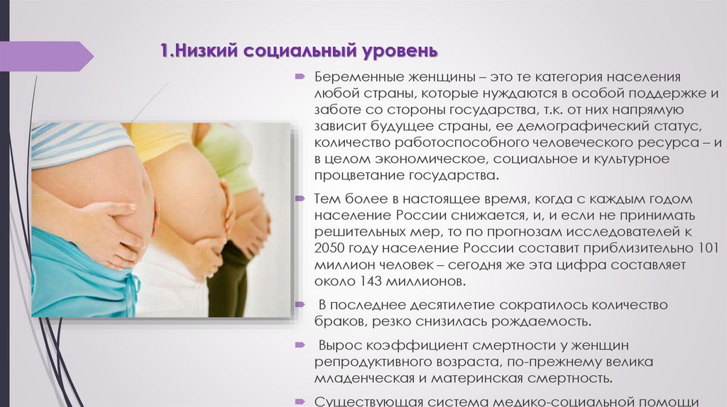 1.Низкий социальный уровеньБеременные женщины – это те категория населения