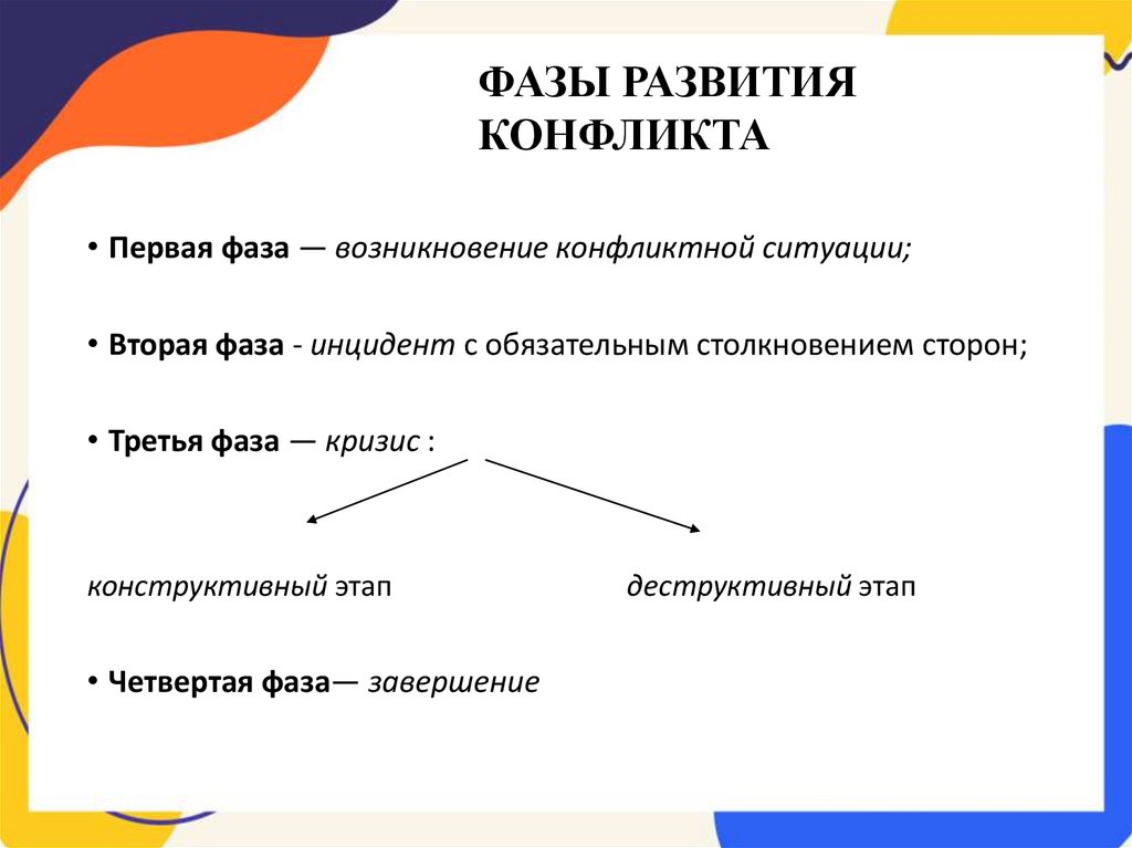 • Первая фаза — возникновение конфликтной ситуации;