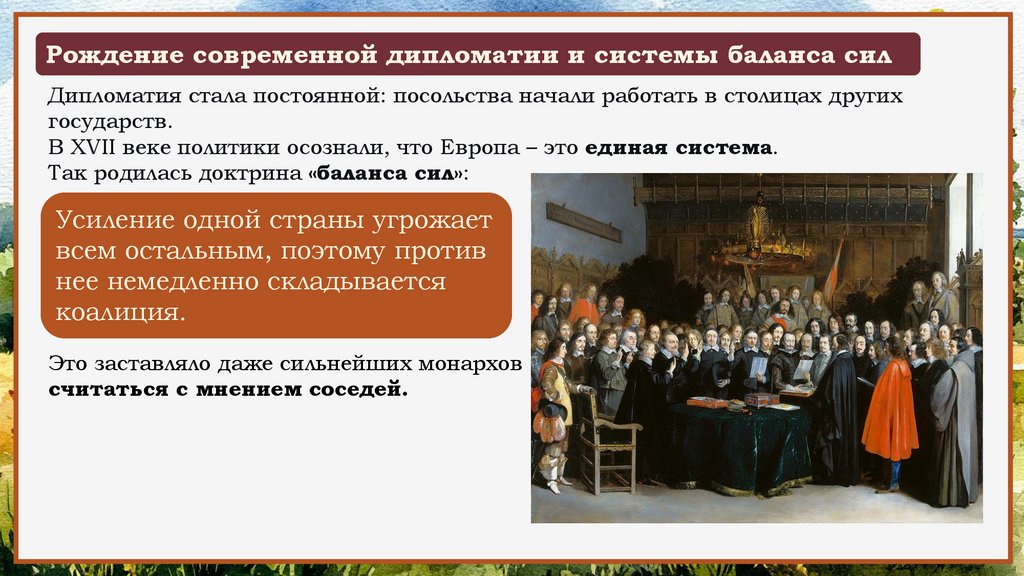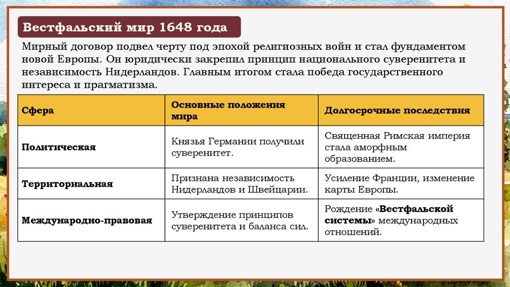 Вестфальский мир 1648 годаМирный договор подвел черту под эпохой религиозных войн и стал фундаментом