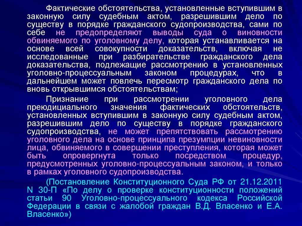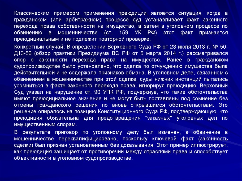Классическим примером применения преюдиции является ситуация, когда вгражданском (или арбитражном) процессе суд устанавливает факт законного