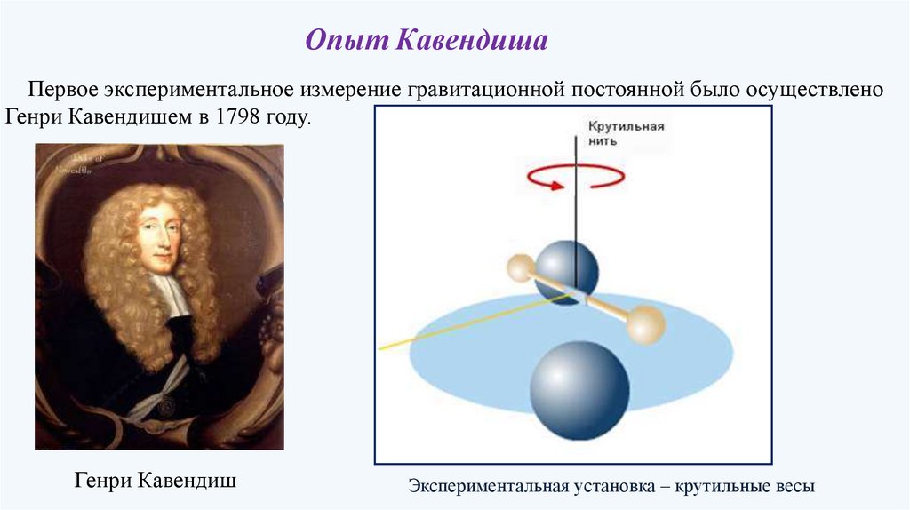 Опыт КавендишаПервое экспериментальное измерение гравитационной постоянной было осуществлено
