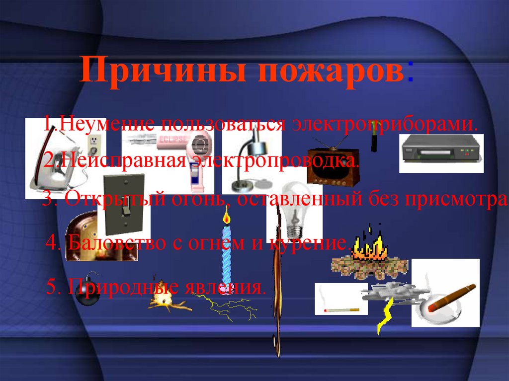 Причины пожаров:1.Неумение пользоваться электроприборами.