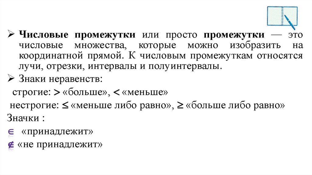 Числовые промежутки или просто промежутки — эточисловые множества, которые можно изобразить на