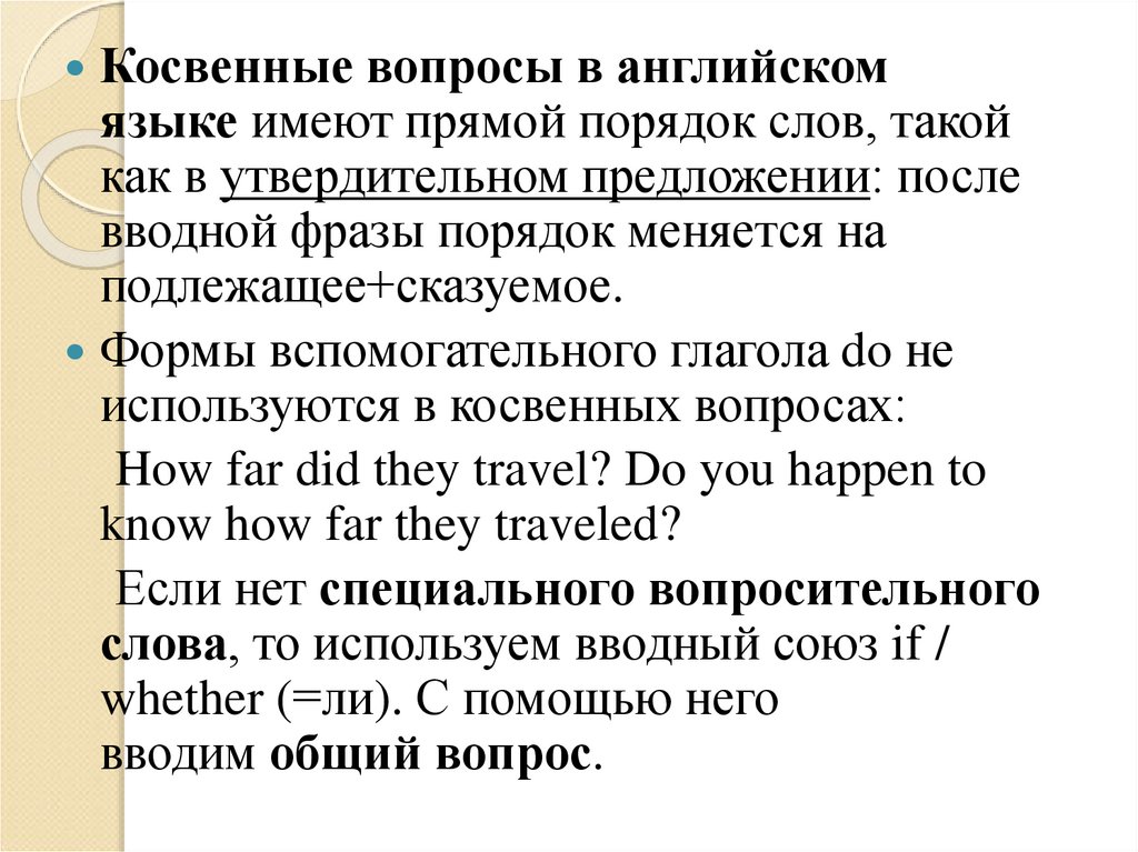 Косвенные вопросы в английскомязыке имеют прямой порядок слов, такой