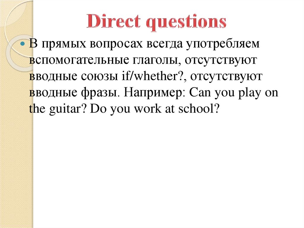 В прямых вопросах всегда употребляемвспомогательные глаголы, отсутствуют