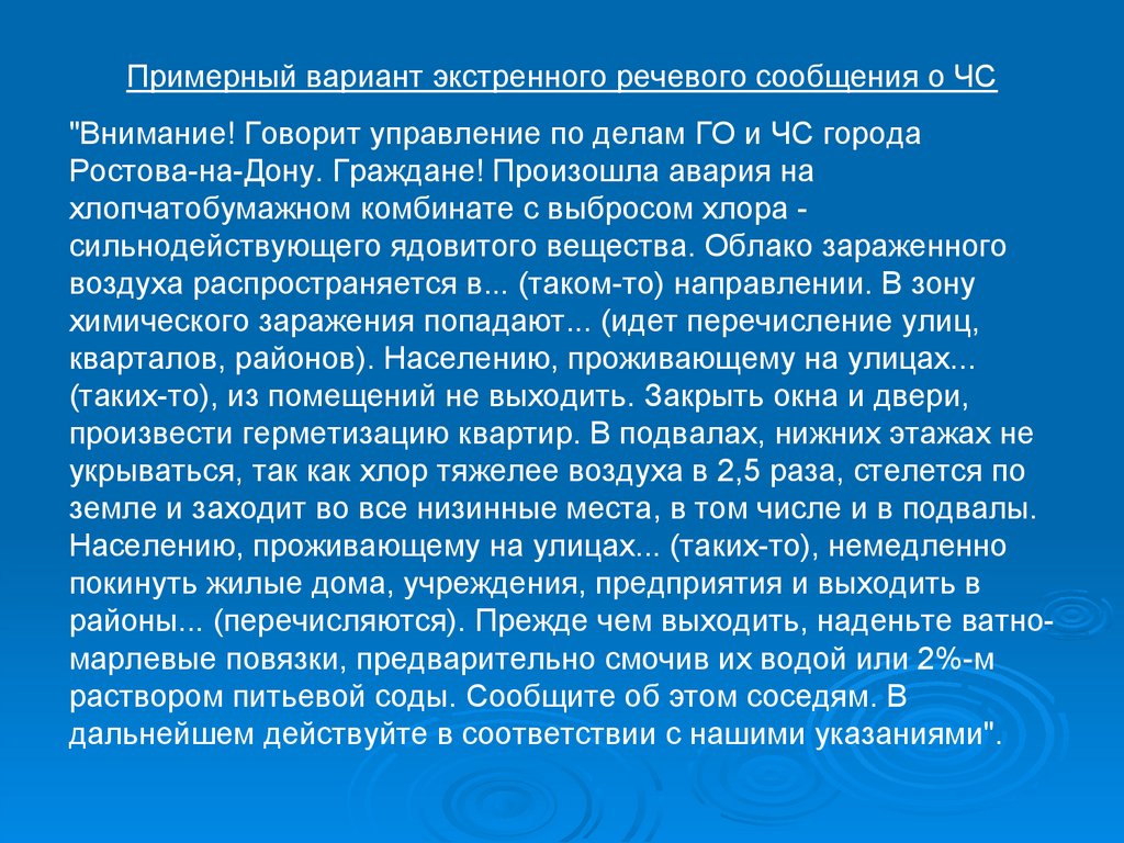 Примерный вариант экстренного речевого сообщения о ЧС"Внимание! Говорит управление по делам ГО и ЧС города