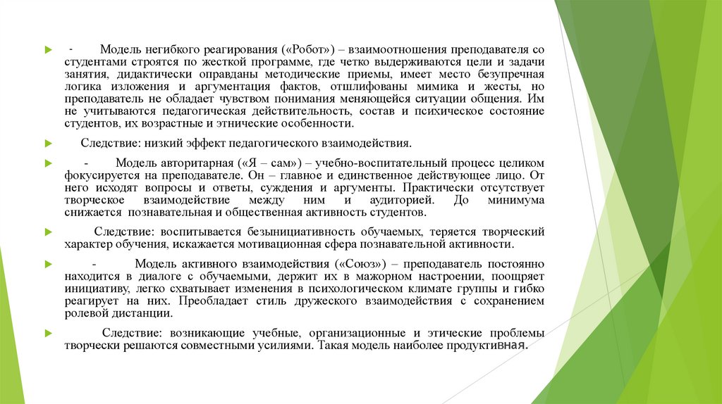 Модель негибкого реагирования («Робот») – взаимоотношения преподавателя состудентами строятся по жесткой программе, где четко выдерживаются цели и задачи