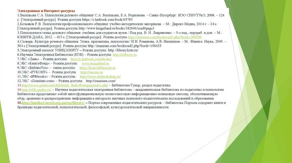 Электронные и Интернет-ресурсы1.Васильева С.А. Психология делового общения/ С.А. Васильева, Е.А. Родионова. – Санкт-Петербург: ИЭО СПбУТУиЭ, 2008. – 124