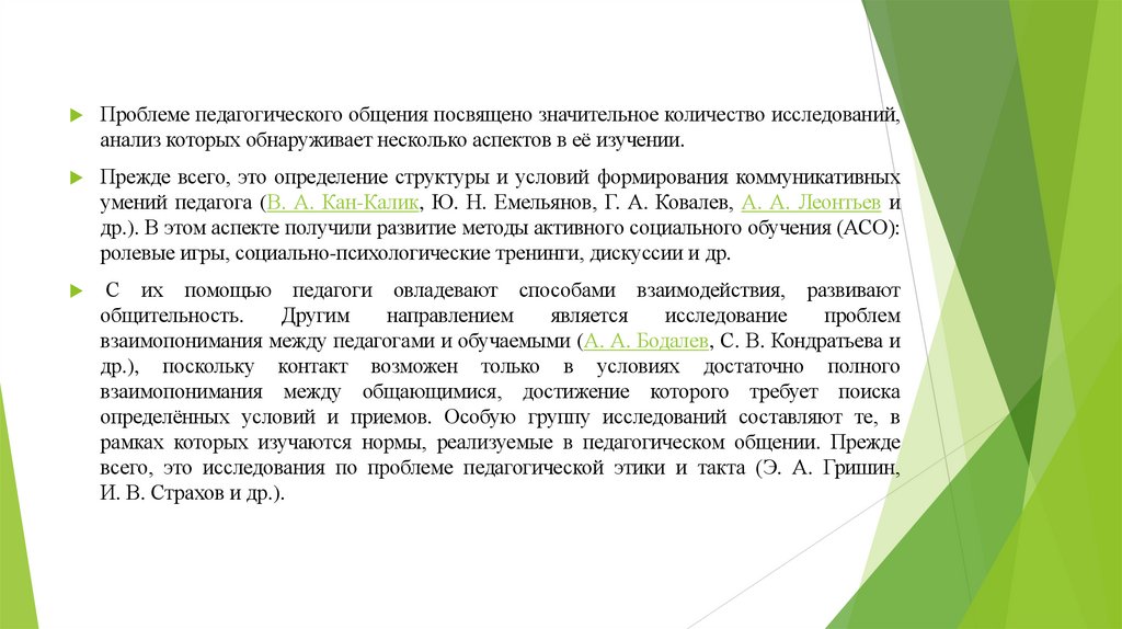 Проблеме педагогического общения посвящено значительное количество исследований,анализ которых обнаруживает несколько аспектов в её изучении.