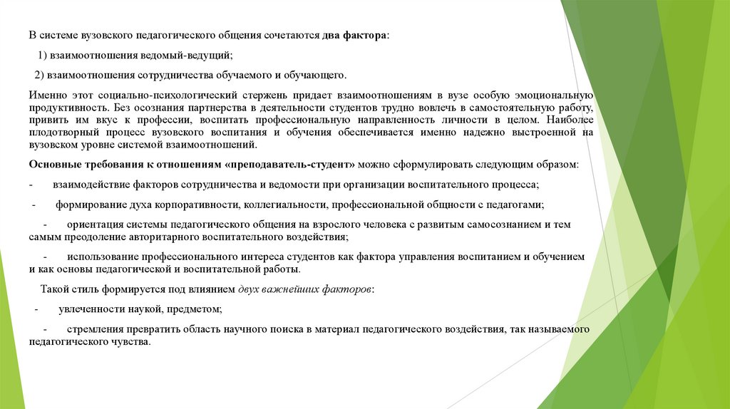 В системе вузовского педагогического общения сочетаются два фактора:1) взаимоотношения ведомый-ведущий;