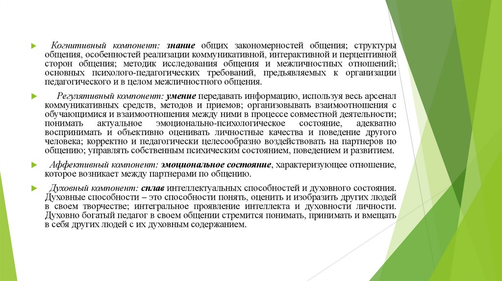 Выделяют компоненты оптимального педагогического общения: когнитивный,