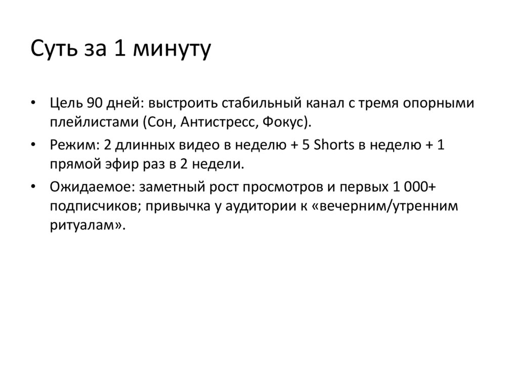 Суть за 1 минуту• Цель 90 дней: выстроить стабильный канал с тремя опорными
