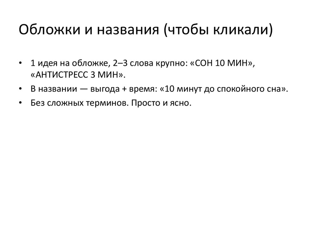Обложки и названия (чтобы кликали)• 1 идея на обложке, 2–3 слова крупно: «СОН 10 МИН»,