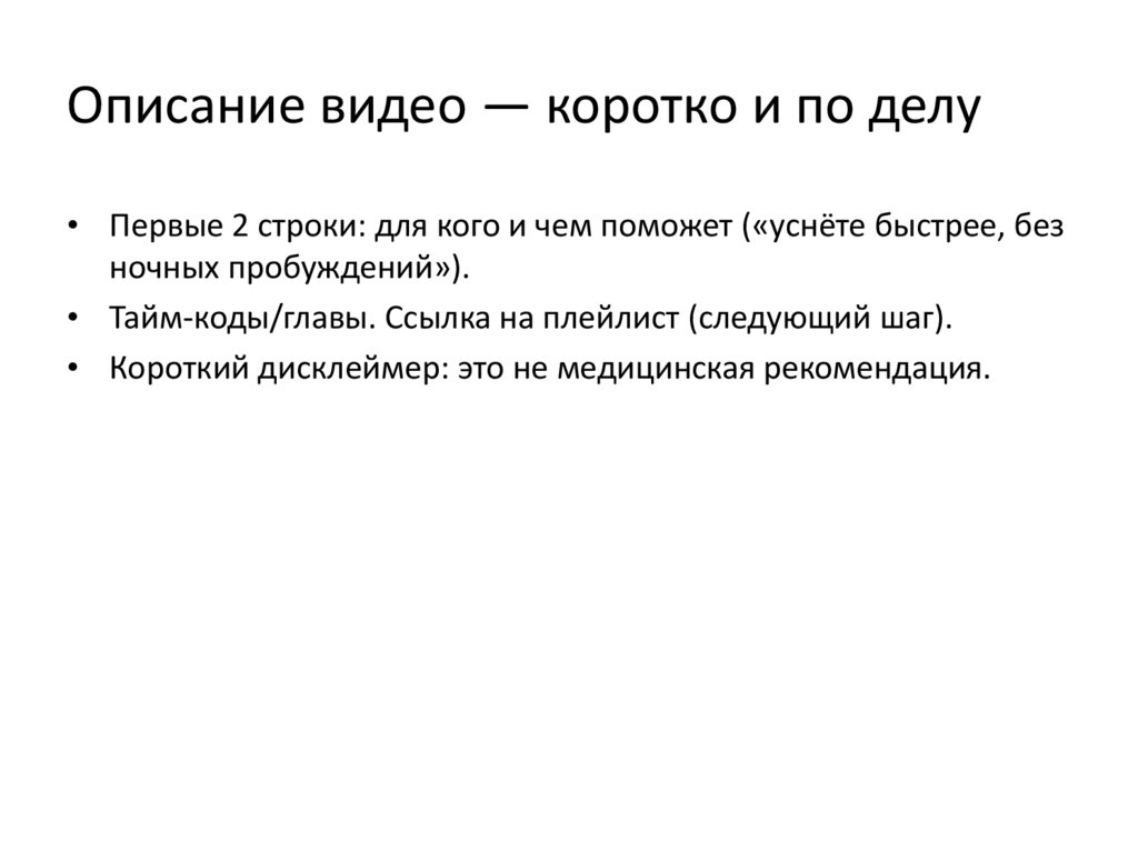 Описание видео — коротко и по делу• Первые 2 строки: для кого и чем поможет («уснёте быстрее, без
