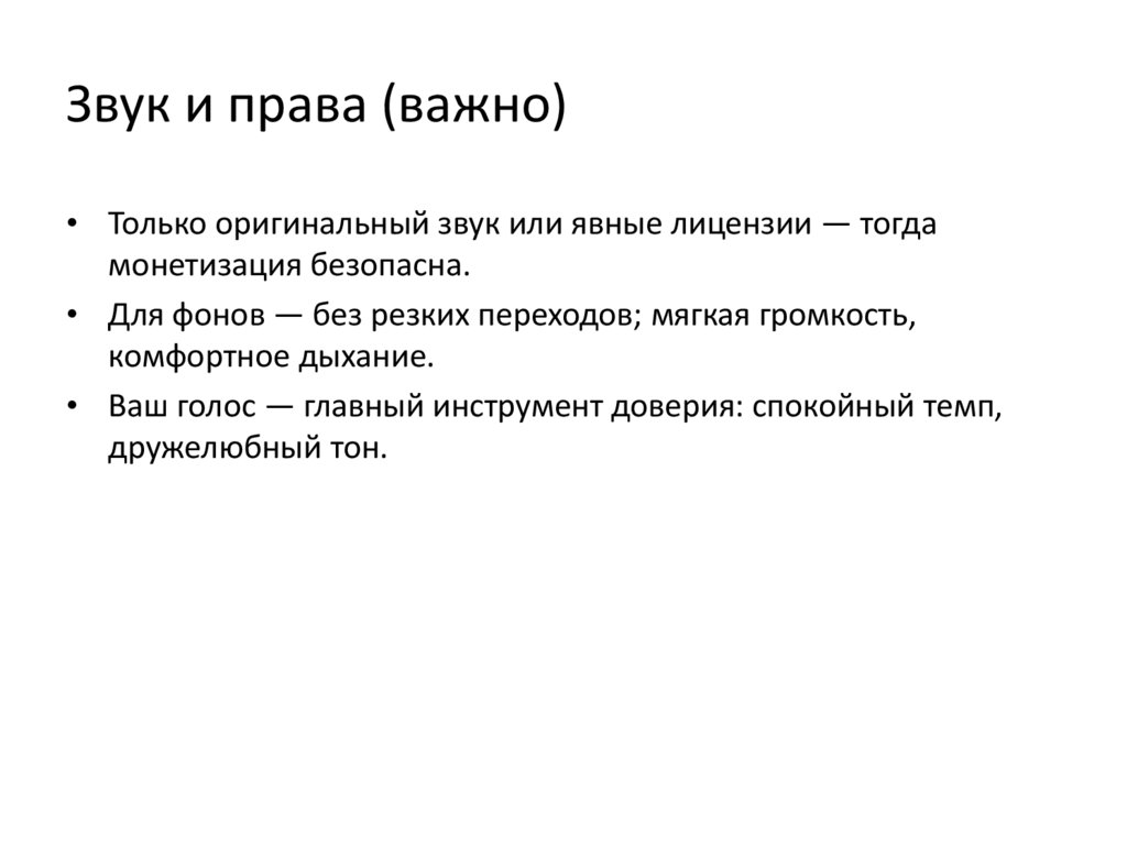 Звук и права (важно)• Только оригинальный звук или явные лицензии — тогда