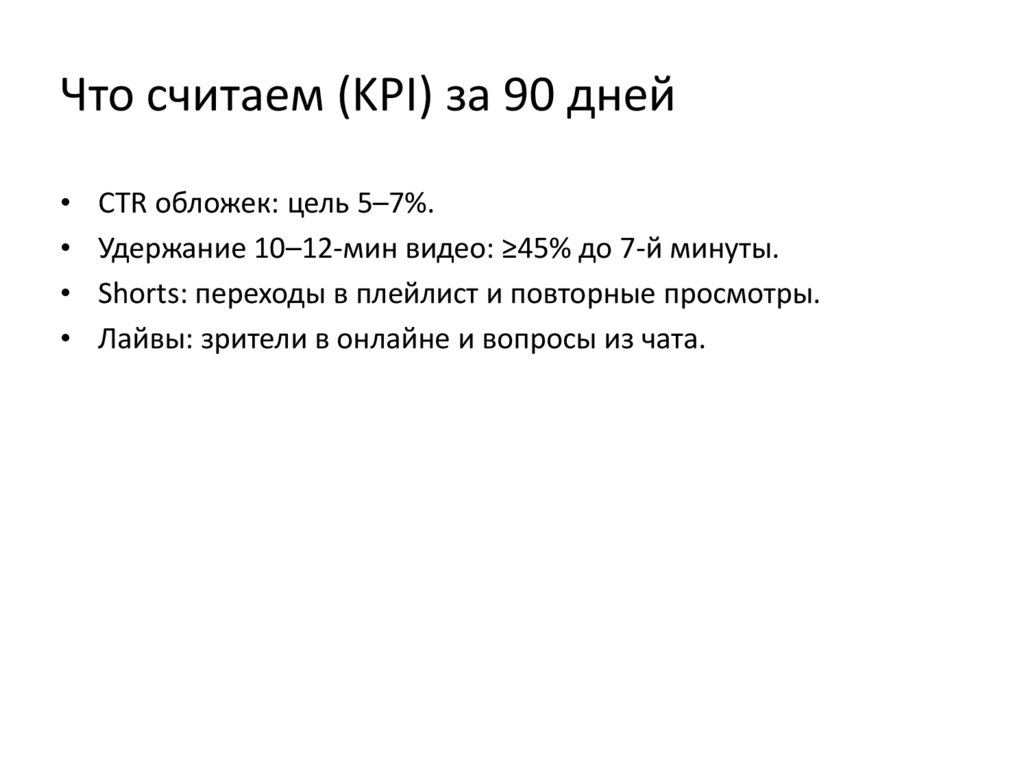 Что считаем (KPI) за 90 днейCTR обложек: цель 5–7%.