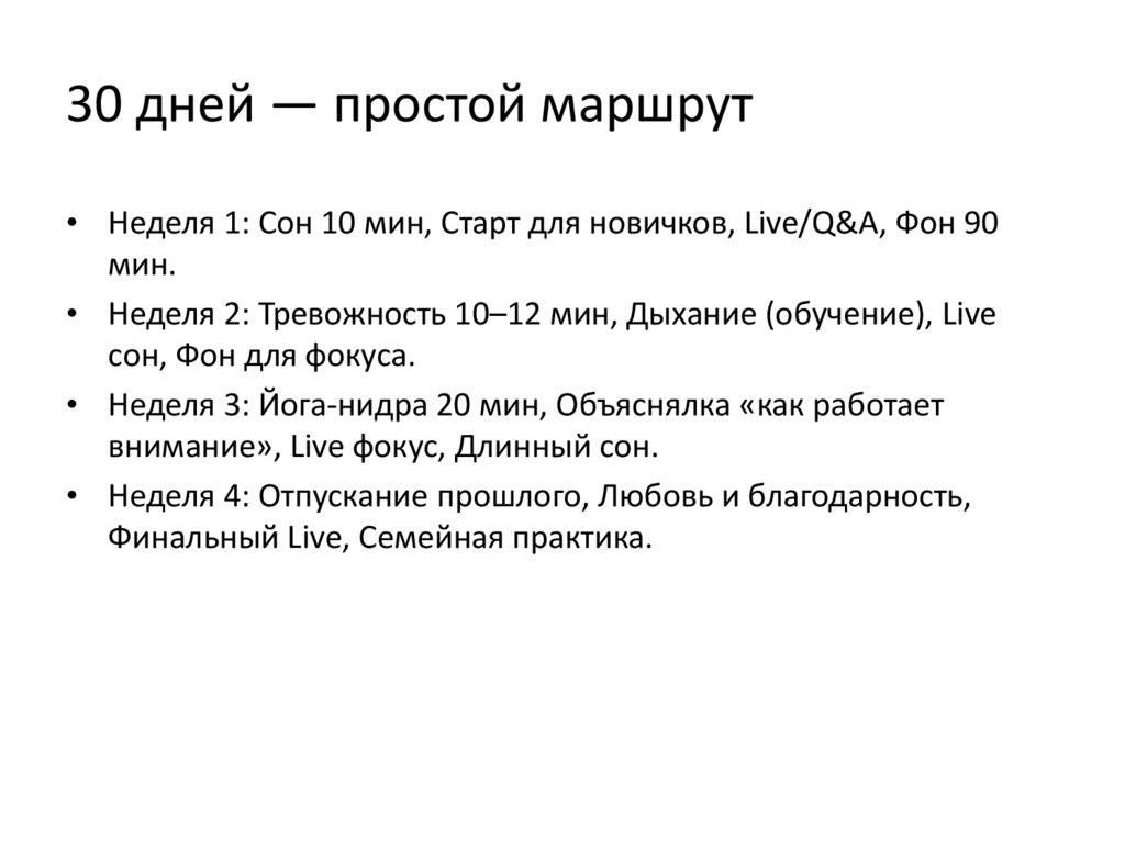30 дней — простой маршрут• Неделя 1: Сон 10 мин, Старт для новичков, Live/Q&A, Фон 90