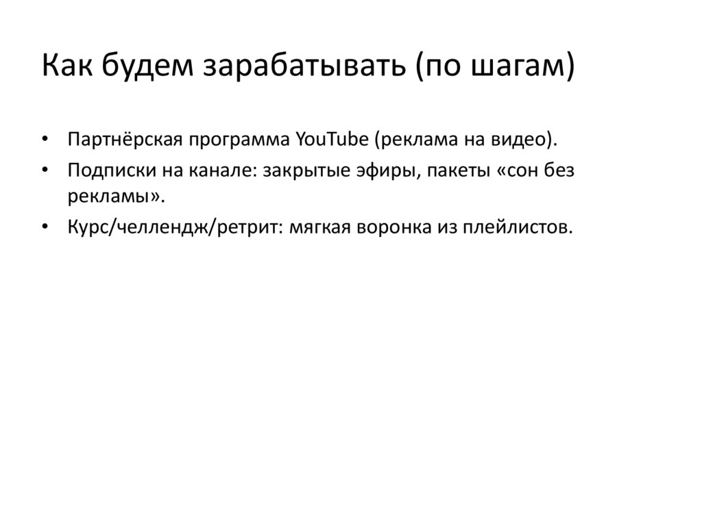 Как будем зарабатывать (по шагам)• Партнёрская программа YouTube (реклама на видео).