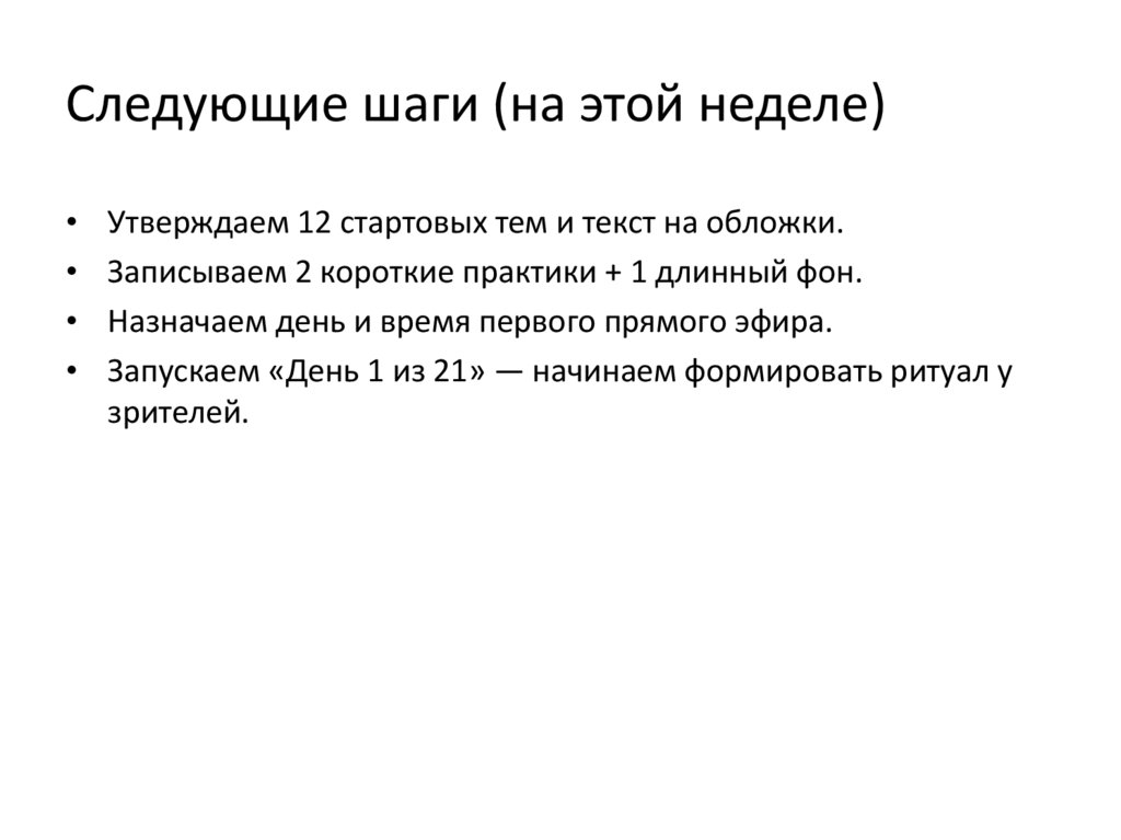 Следующие шаги (на этой неделе)Утверждаем 12 стартовых тем и текст на обложки.