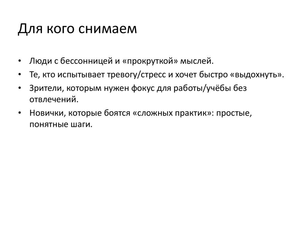 Для кого снимаем• Люди с бессонницей и «прокруткой» мыслей.