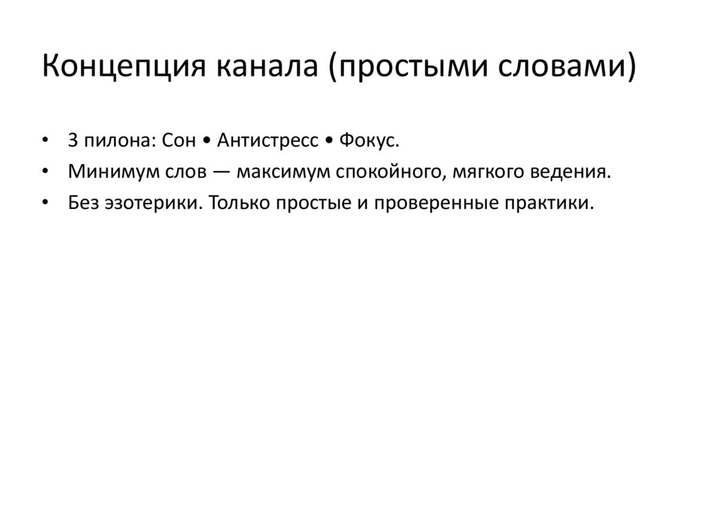 Концепция канала (простыми словами)• 3 пилона: Сон • Антистресс • Фокус.
