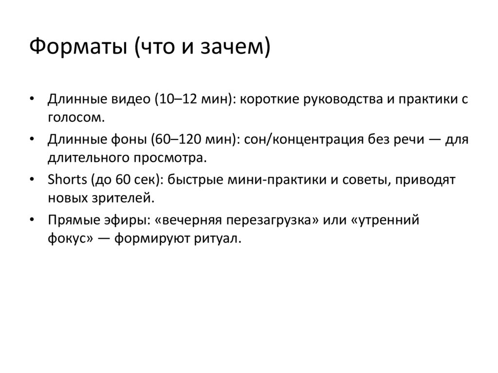 Форматы (что и зачем)• Длинные видео (10–12 мин): короткие руководства и практики с