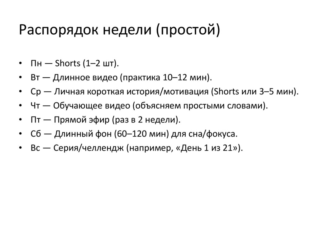 Распорядок недели (простой)Пн — Shorts (1–2 шт).