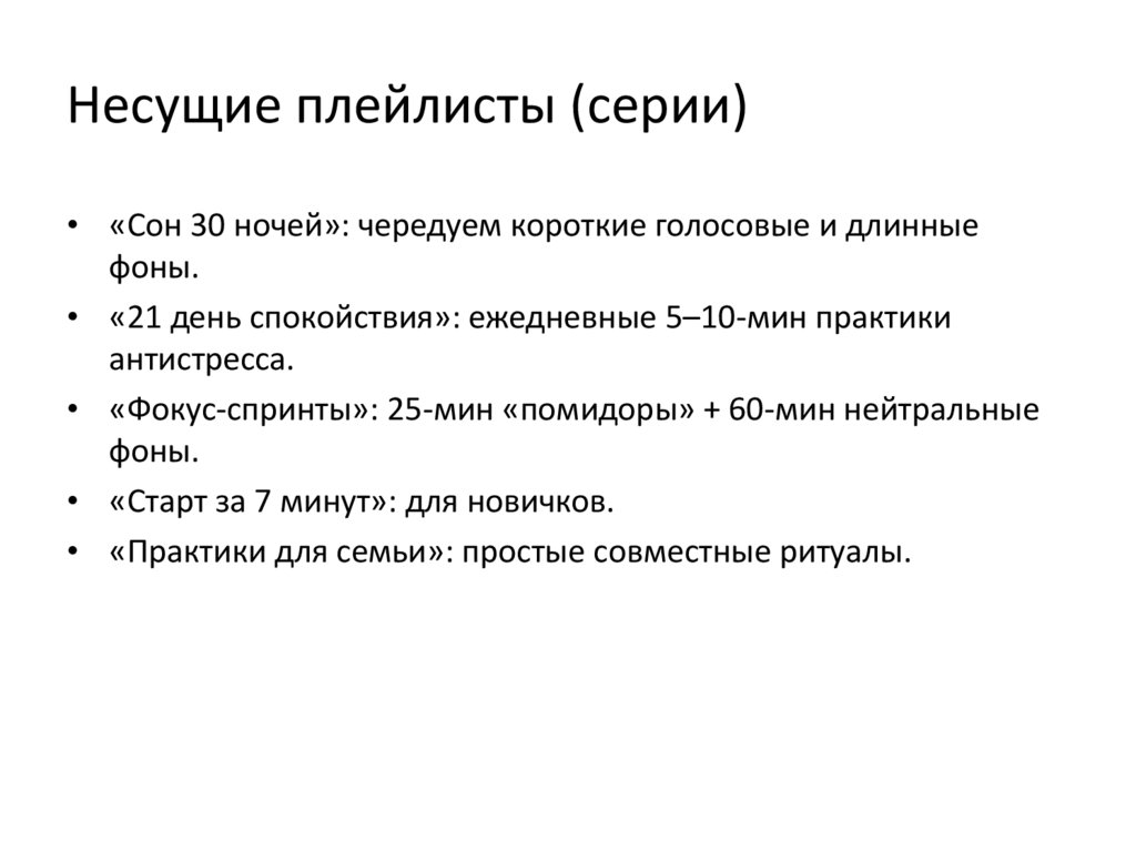 Несущие плейлисты (серии)• «Сон 30 ночей»: чередуем короткие голосовые и длинные