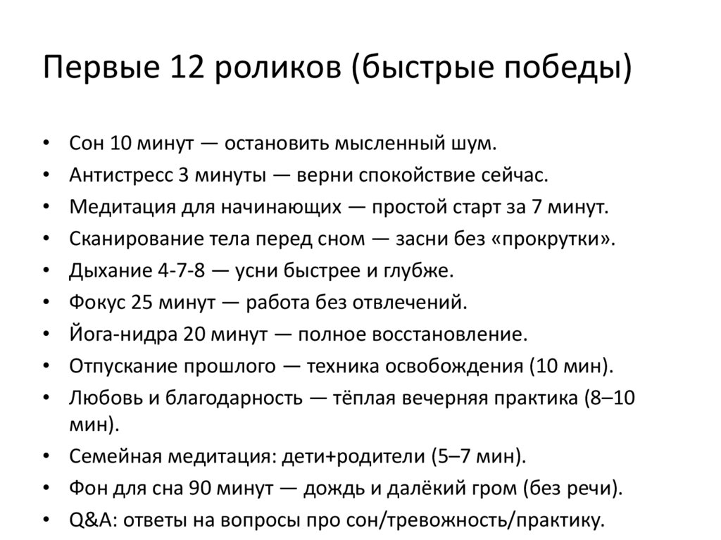 Первые 12 роликов (быстрые победы)Сон 10 минут — остановить мысленный шум.