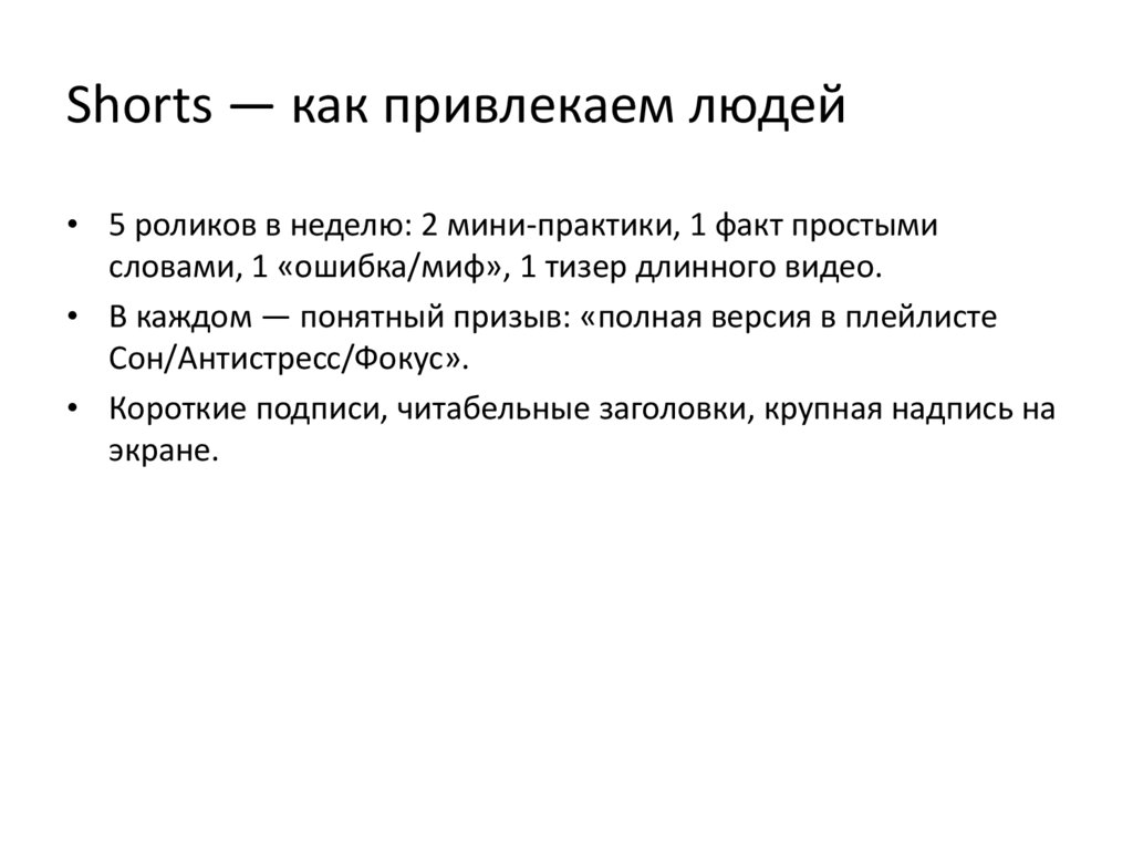 Shorts — как привлекаем людей• 5 роликов в неделю: 2 мини-практики, 1 факт простыми