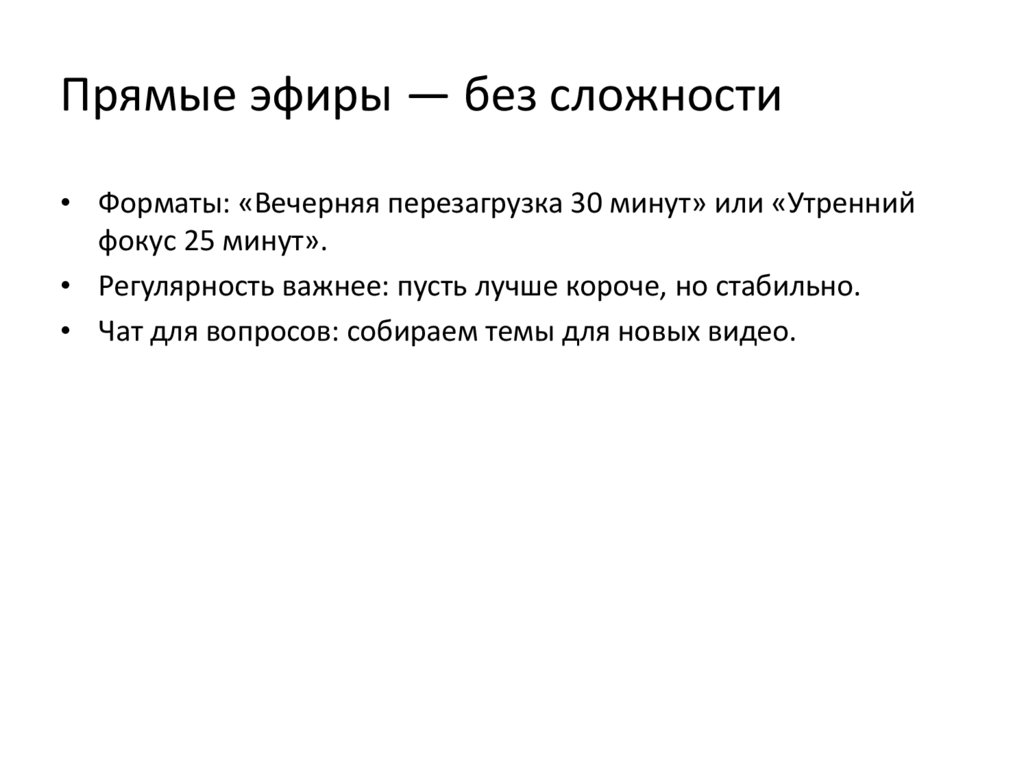 Прямые эфиры — без сложности• Форматы: «Вечерняя перезагрузка 30 минут» или «Утренний