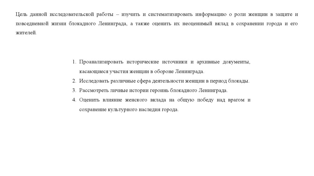 Цель данной исследовательской работы – изучить и систематизировать информацию о роли женщин в защите иповседневной жизни блокадного Ленинграда, а также оценить их неоценимый вклад в сохранении города и его