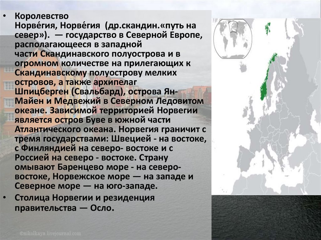 • КоролевствоНорве́гия, Норве́гия (др.скандин.«путь на