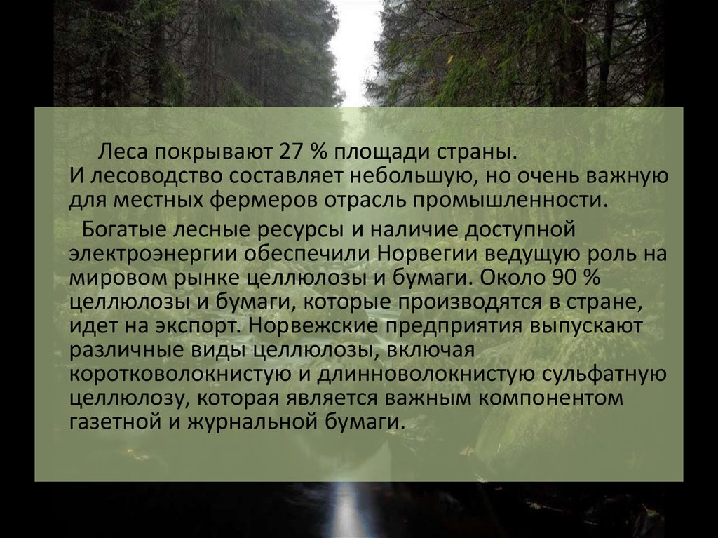 Леса покрывают 27 % площади страны.И лесоводство составляет небольшую, но очень важную