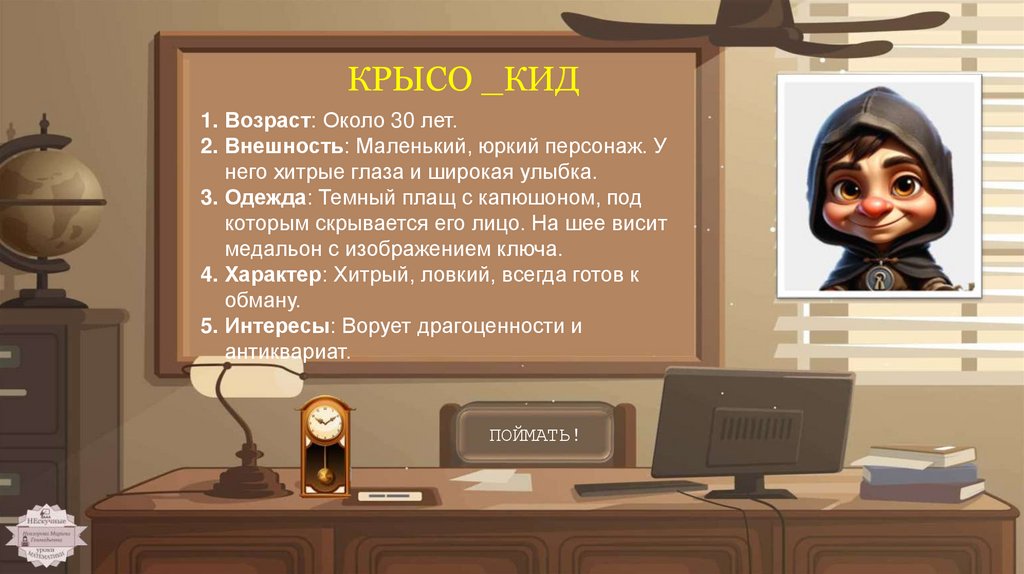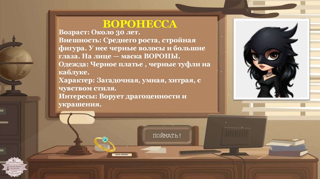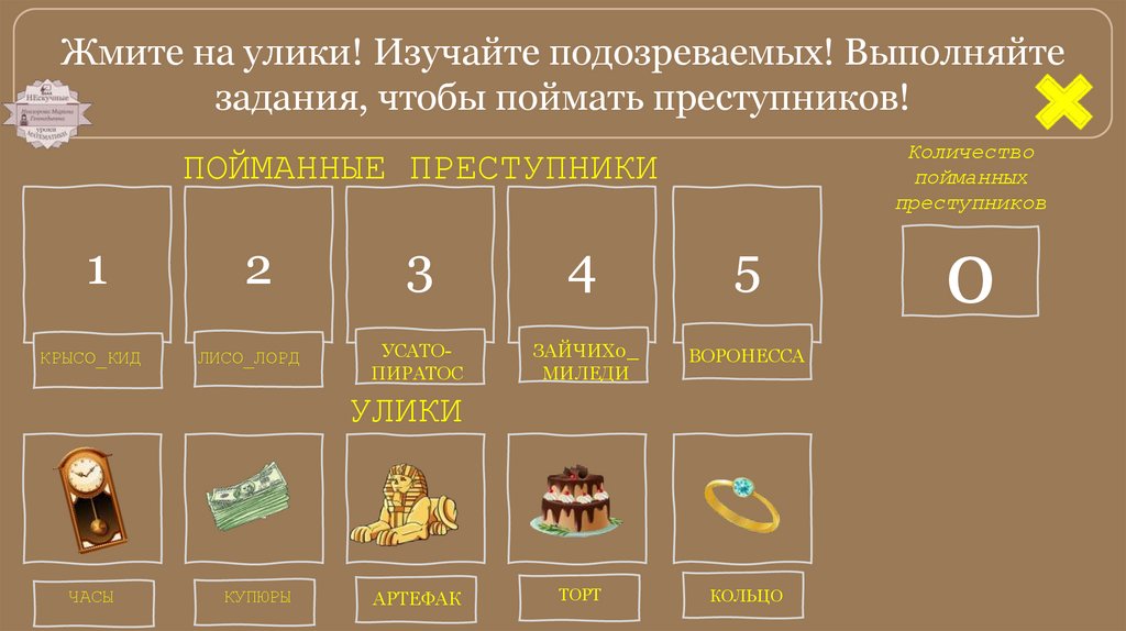 Жмите на улики! Изучайте подозреваемых! Выполняйтезадания, чтобы поймать преступников!
