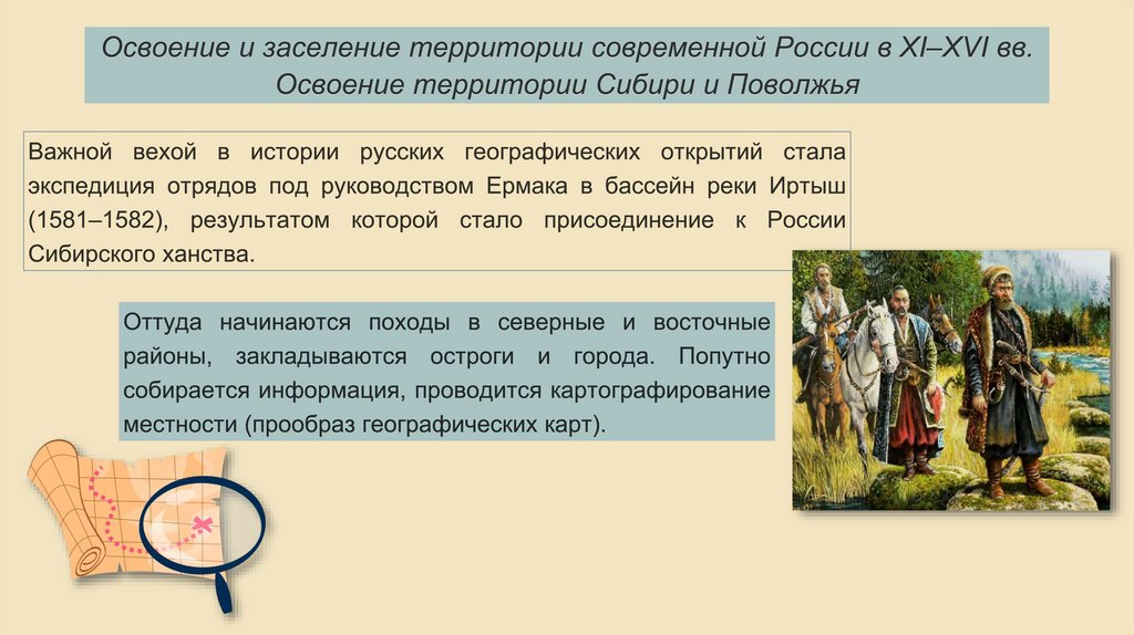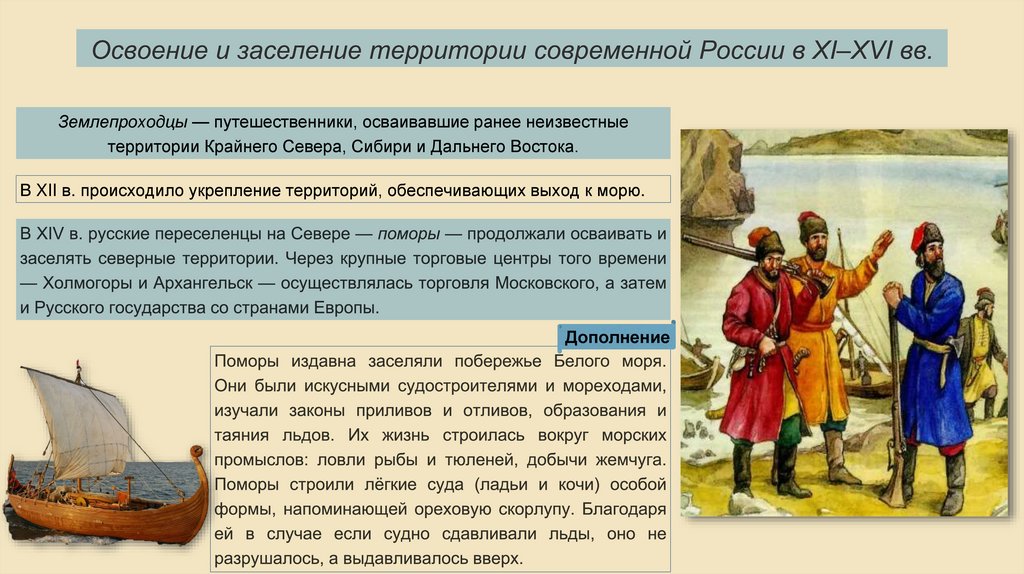 Землепроходцы — путешественники, осваивавшие ранее неизвестныетерритории Крайнего Севера, Сибири и Дальнего Востока.