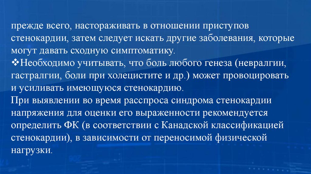 прежде всего, настораживать в отношении приступовстенокардии, затем следует искать другие заболевания, которые