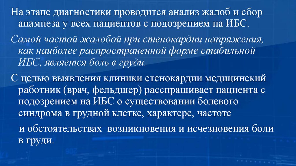 На этапе диагностики проводится анализ жалоб и сборанамнеза у всех пациентов с подозрением на ИБС.
