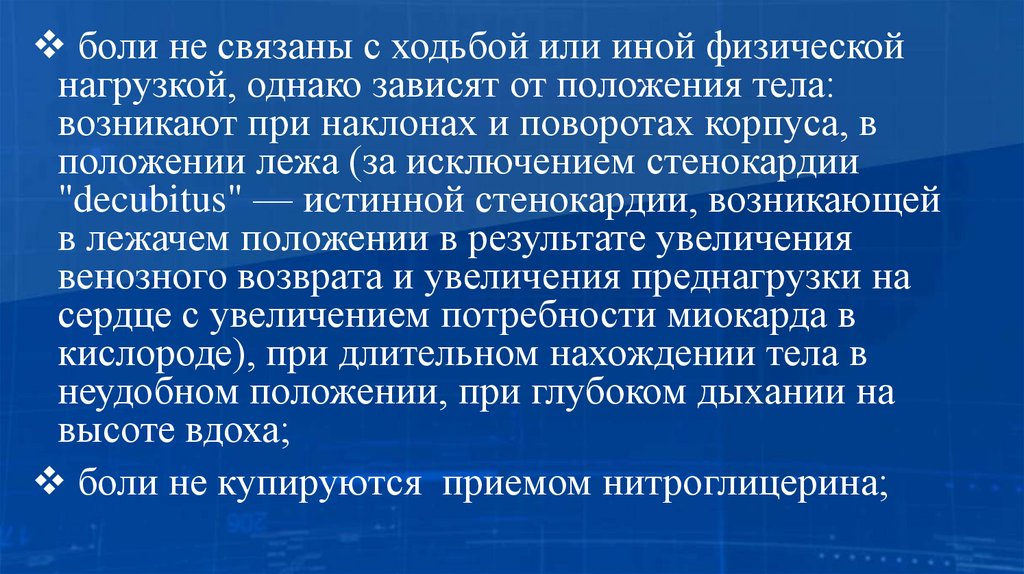 боли не связаны с ходьбой или иной физическойнагрузкой, однако зависят от положения тела: