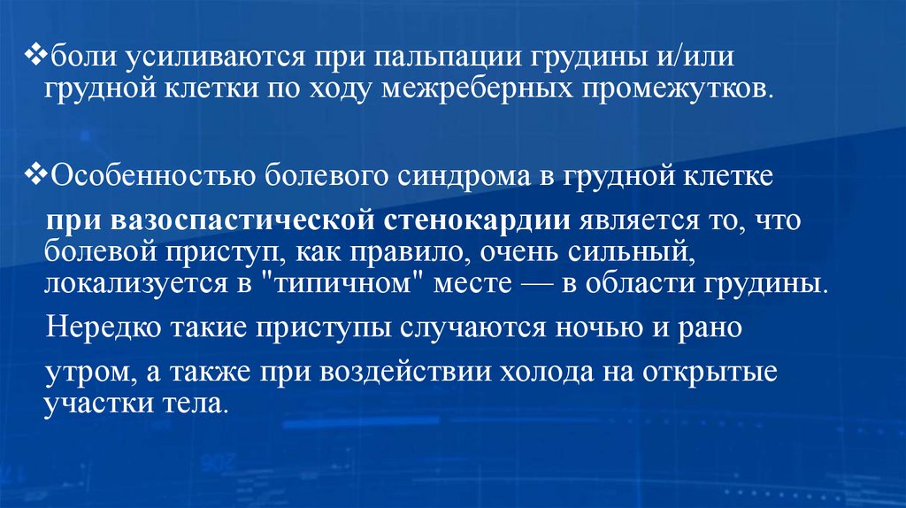 боли усиливаются при пальпации грудины и/илигрудной клетки по ходу межреберных промежутков.