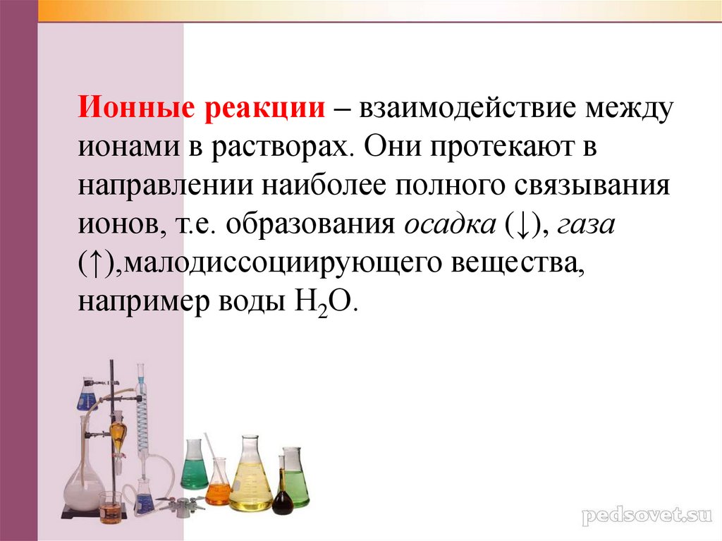 Ионные реакции – взаимодействие междуионами в растворах. Они протекают в